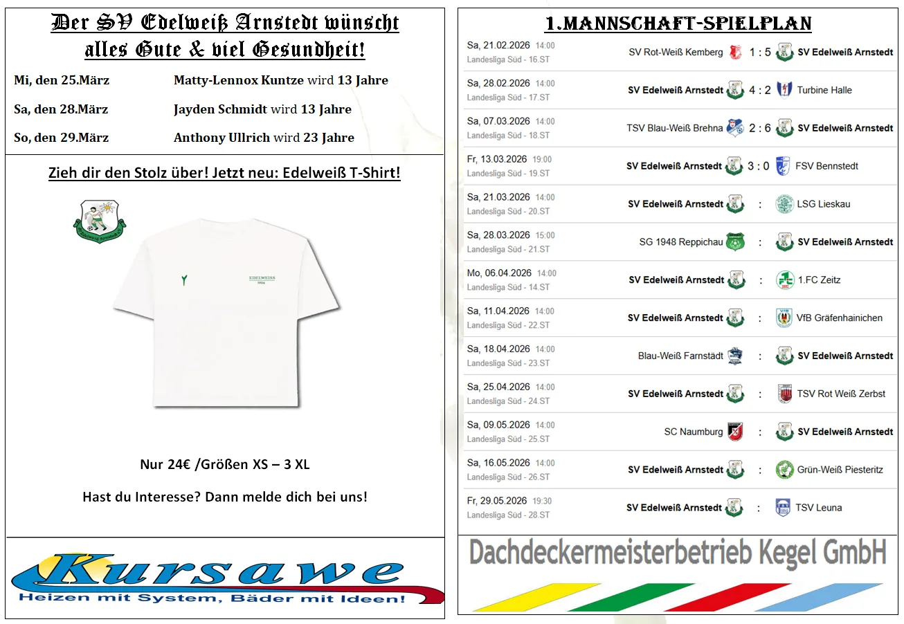 Auch in dieser Saison wird unser Programmheft der Edelweiß-Kurier am Spieltag (ab 06:00 Uhr) auch online auf unserer Homepage veröffentlich. So verpasst ihr kein Programmheft, auch wenn ihr es mal nicht zum Edelweißen Heimspiel schafft. Viel Spaß beim Lesen :)