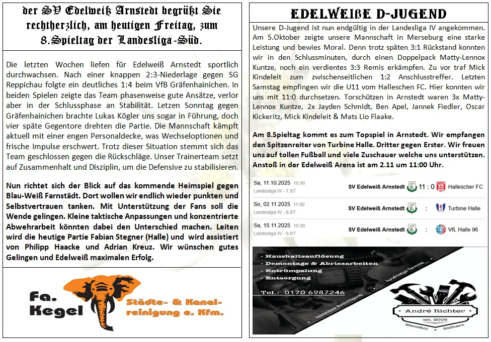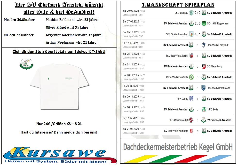 Auch in dieser Saison wird unser Programmheft der Edelweiß-Kurier am Spieltag (ab 06:00 Uhr) auch online auf unserer Homepage veröffentlich. So verpasst ihr kein Programmheft, auch wenn ihr es mal nicht zum Edelweißen Heimspiel schafft. Viel Spaß beim Lesen :)